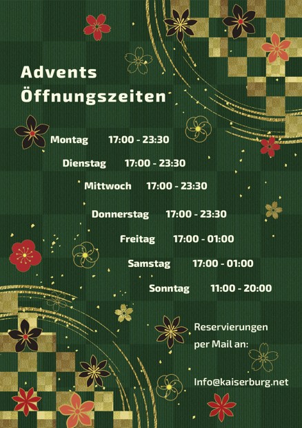 Sonntag - Ruhetag | im Dez. ab 12:00 - 20:00