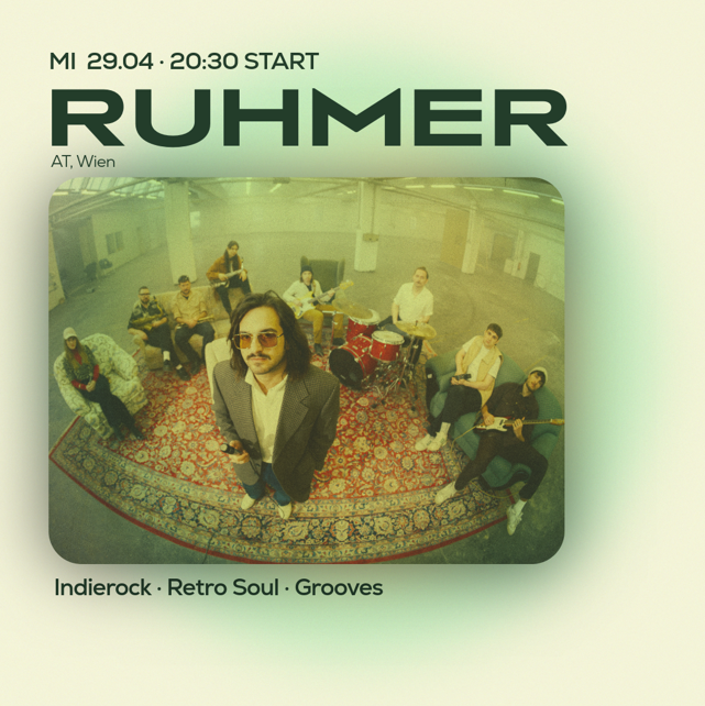 RUHMER ist kein klassischer Live-Act, sondern ein Erlebnis, das den Raum von innen heraus zum Leuchten bringt. Warme Soul-Hooks, druckvolle Bläser und treibender Indie-Sound verbinden sich zu einer Show, die sofort greift – körperlich, direkt und voller Energie.