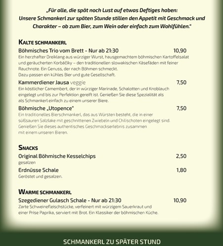 Genießen Sie auch noch am späten Abend nach Küchenschluss passend zum Bier oder einfach so, unser Klassiker sowie Bierschmankerl.